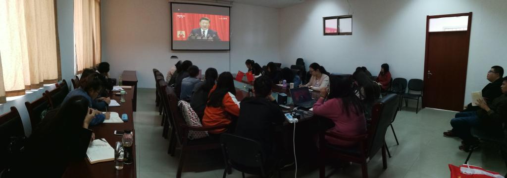 全体师生认真听取了习近平总书记代表第十八届中央委员会向大会所做的报告�报告围绕新时代坚持和发展什么样的中国特色社会主义,怎样坚持和发展中国特色社会主义这个重大时代课题,深刻阐述了新时代中国特色社会主义思想的科学体系、精神实质和丰富内涵,准确把握中国特色社会主义发展新时代的历史方位、基本方略和主要矛盾的转化等重大问题,牢牢把握和立足社会主义初级阶段的基本国情和实际来谋篇布局,绘就了新时代中国特色社会主义的宏伟蓝图,吹响了新时代中国特色社会主义的进军号�跟随习近平总书记的讲话,大家认真观看,深切感悟,并认真做记录,了解了过去五年我国在各个方面的发展状况,以及未来祖国的发展蓝图,接受了一次精神上的洗礼�