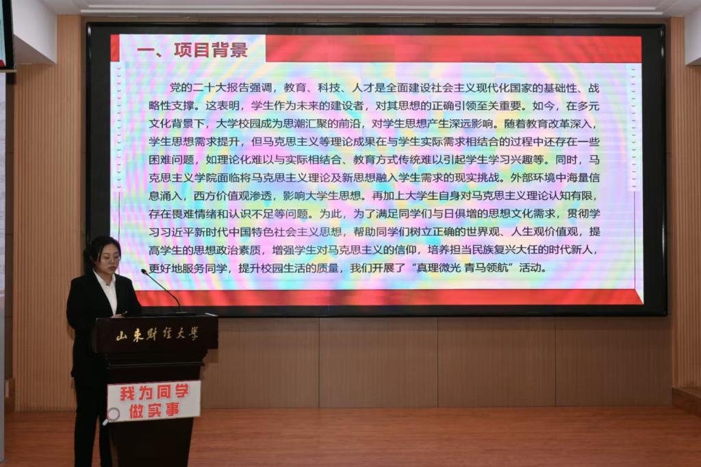 11�7日下午,山东财经大学首届学生会组织“我为同学做实事”项目交流展示活动暨秋季培训会在燕山校区举办。全校共17个研究生会项目参与,产生了研究生会精品项�2个,优秀项目3个。我院项目“真理微� 青马领航”荣获研究生会精品项目�
