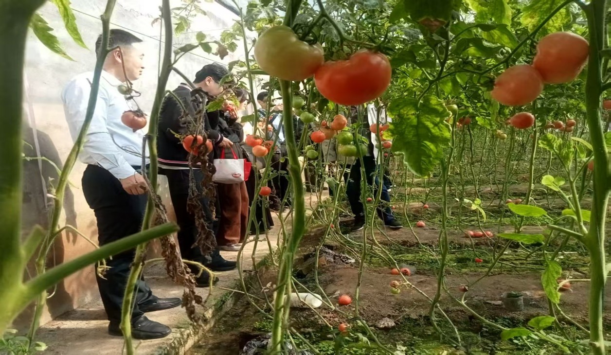 调研小组参观了李中荣村党建活动室后,与村委领导班子成员一起来到田间地头,实地考察李中荣村的农作物种植情况。在西红柿大棚内,调研小组仔细观察了作物长势,并向农户详细了解种植技术和市场销售情况。当地西红柿、大蒜和生姜等种植历史悠久,另外还广泛种植白菜、生菜、萝卜、雪里红等各类蔬菜,品种丰富。近年来,在驻村第一书记杨波的带领下,该村在发展特色产业的同时,不断探索创新发展之路,例如通过蔬菜礼盒等创新形式,提升农产品附加值,增加村民收入,同时积极探索葫芦工艺、剪纸艺术等民俗文化产业创新发展之路。村民通过种植葫芦、加工工艺品实现增收致富,当地合作社推出“三免一保”惠农计划,为种植户免费提供葫芦苗、技术指导和肥料农药并保价回收产品,有效降低农户种植风险,目前村庄已形成“育苗—种植—加工—互联网销售”的完整产业链,还通过直播带货等新型销售模式拓宽渠道,打造地域特色乡村产业品牌。
