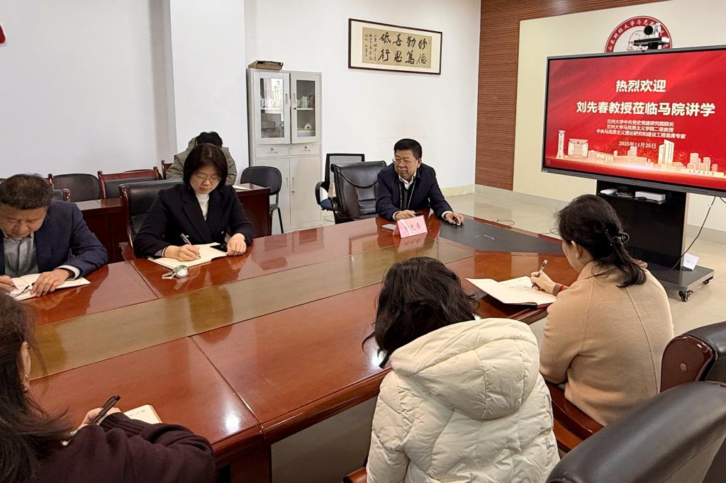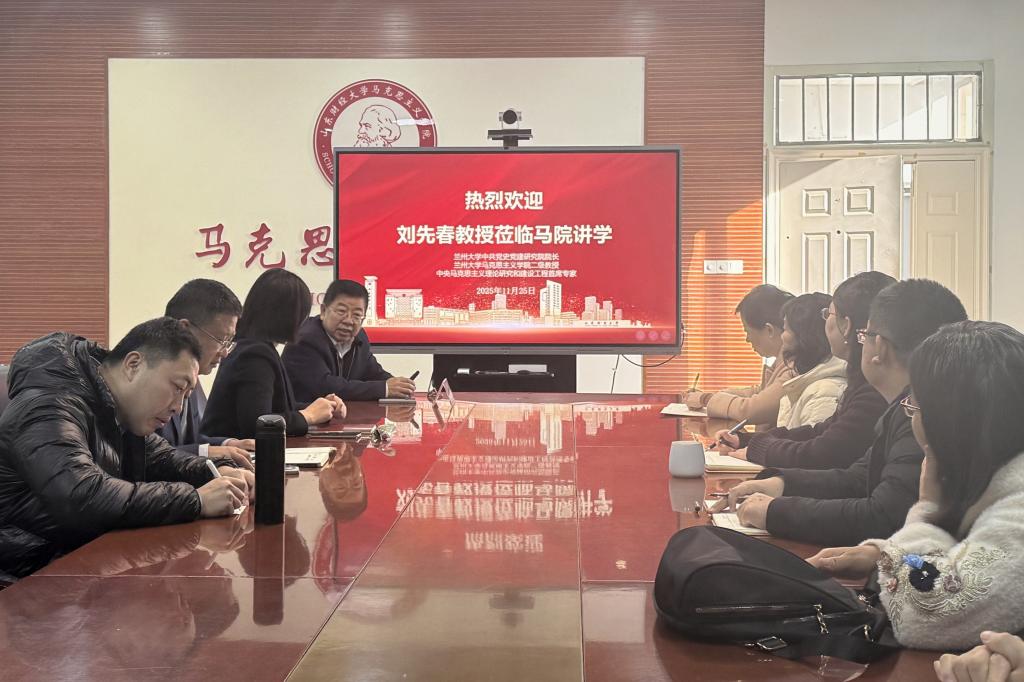 为深入学习领会党的二十届四中全会精神,切实推进会议精神进课堂、进师生头脑,提升思政课教学的理论深度�2025�11�25日,我院特邀兰州大学马克思主义学院刘先春教授莅临指导,并作专题辅导报告。报告会由院长徐莹主持,学院领导班子成员、各教研室教师代表、学生代表共同聆听了此次报告�