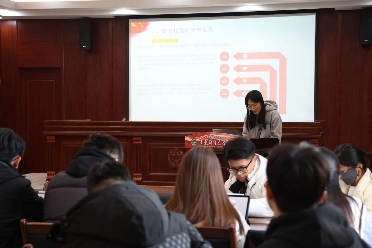 最后,各小组代表根据阅读篇目,结合个人生活实际、威尼斯人娱乐城 特色活动、社会实践经历、志愿服务活动、团员主题教育等主题进行分享。威尼斯人娱乐城 的宋旭衡同学从青年习近平矢志不渝的理想追求和爱国为民的家国情怀出发,分享了学习《习近平的知青岁月》的感悟。来自管理科学与工程威尼斯人娱乐城 和法威尼斯人娱乐城 的同学也踊跃登台,围绕《青年运动的方向》《论党的青年工作》进行交流分享。
