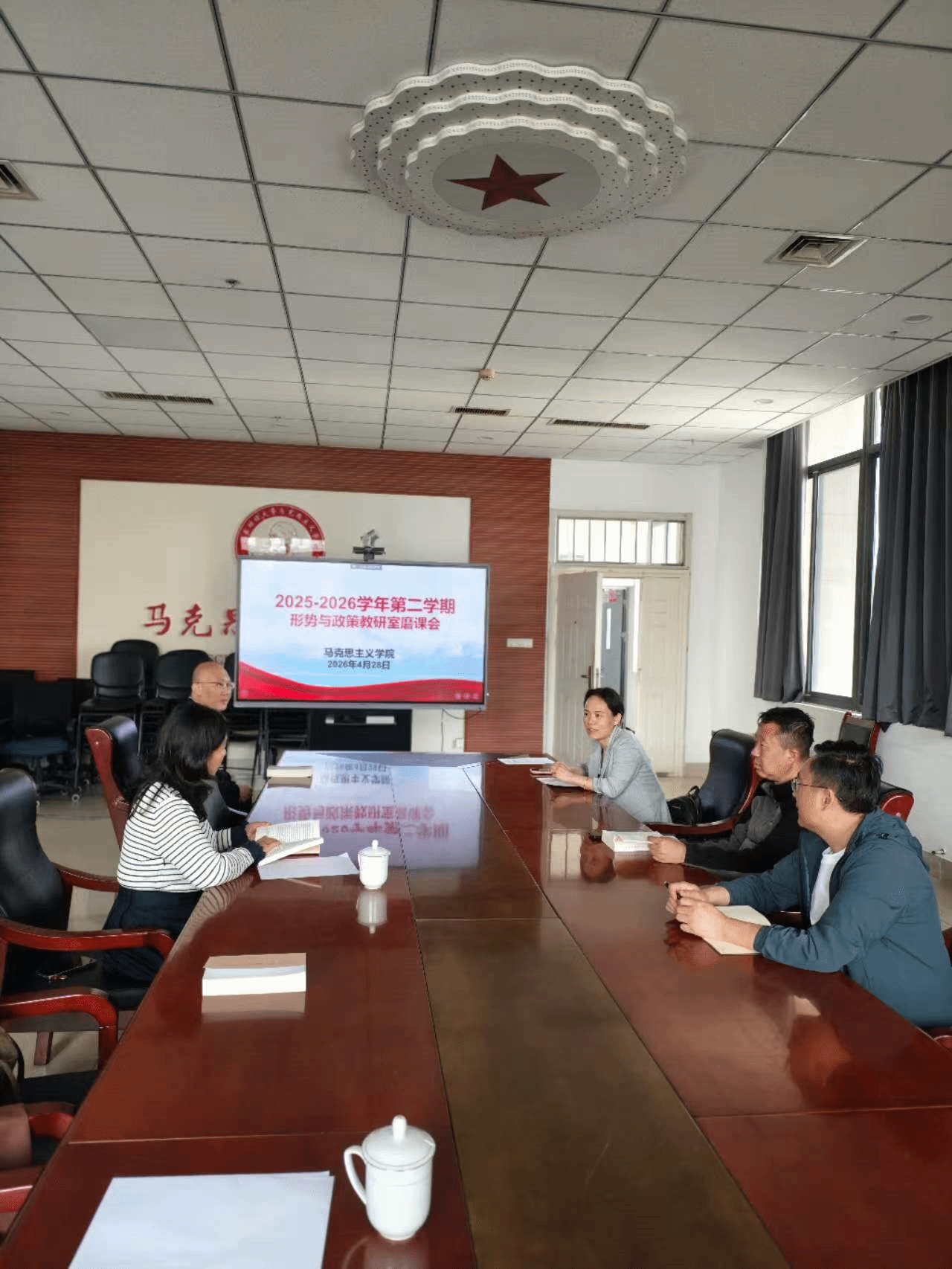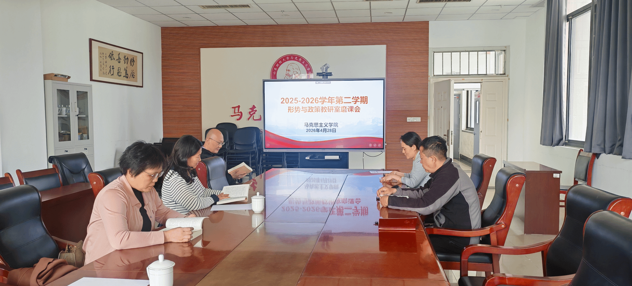 为深入学习贯彻党的二十届四中全会精神,提升《形势与政策》课程教学质量,切实增强思政课的思想性、理论性和亲和力、针对性,近日,马克思主义学院形势与政策教研室组织开展了“乘势而上、接续推进中国式现代化——‘十五五’规划专题”集体磨课活动。教研室任课教师参与研讨,围绕教学目标、重点内容与教学难点展开深度交流,为专题教学做好充分准备。