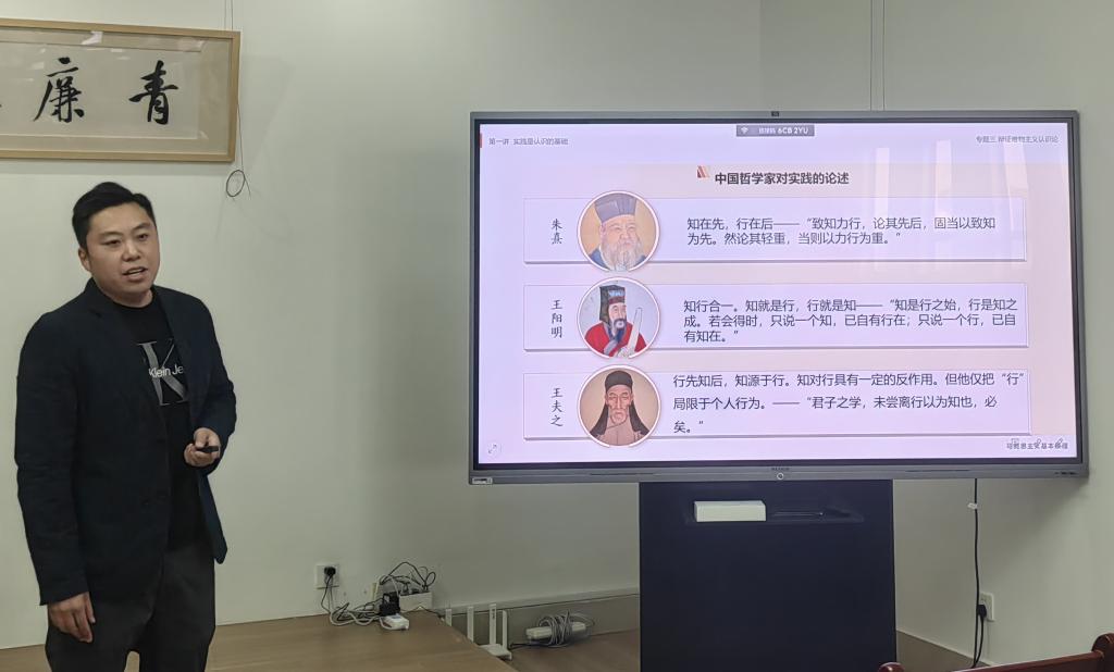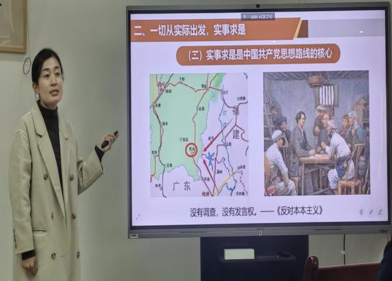 第一阶段,刘东方、刘丹璇两位青年教师分别以“科学实践观”“一切从实际出发,实事求是”为主题进行了讲课展示。到会的教研室老师进行了认真观摩和学习。紧接着各位老师围绕两位老师的讲课情况进行了认真点评,肯定了他们在逻辑、语言、内容、教态上的表现,也结合自己的教学经验,对有待改进的地方提出了建议。