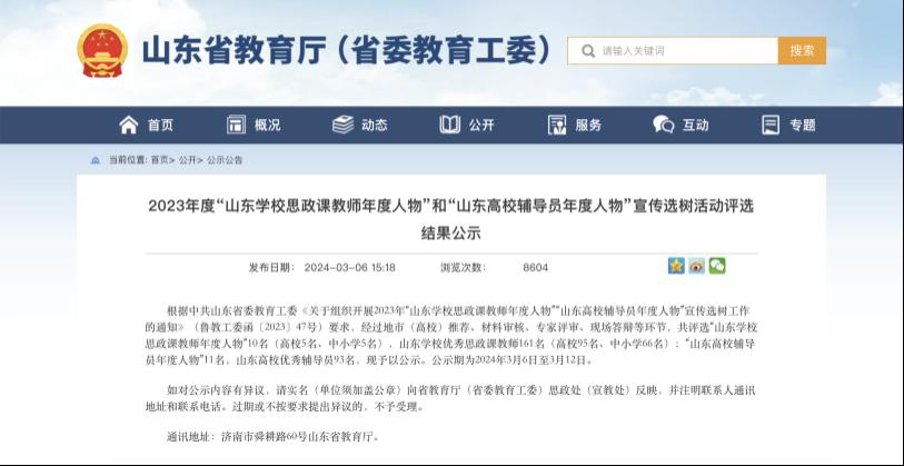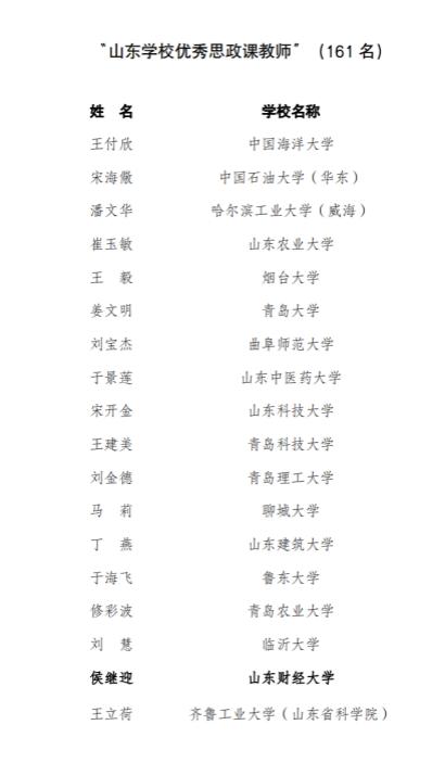 根据中共山东省委教育工委《关于组织开展2023年“山东学校思政课教师年度人物”“山东高校辅导员年度人物”宣传选树工作的通知》(鲁教工委函〔2023〕47号)要求,本次评优共评选山东学校优秀思政课教师161名(高校95名、中小学66名)。侯继迎老师凭借突出的专业素养和丰富的育人实践,经过多个环节层层筛选,脱颖而出,成功入围“山东学校优秀思政课教师”名单。